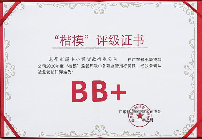 近日,廣東省地方金融監(jiān)管局組織了2020年度“楷模”監(jiān)管評(píng)級(jí)活動(dòng),我公司集團(tuán)下屬瑞豐小額貸款公司被評(píng)為“BB+”級(jí)。 此次活動(dòng),是廣東省地方金融監(jiān)管局為貫徹落實(shí)《中國(guó)銀保監(jiān)會(huì)辦公廳關(guān)于加強(qiáng)小額貸款公司監(jiān)督管理的通知》(銀保監(jiān)辦發(fā)〔2020〕86號(hào))精神,對(duì)轄內(nèi)開(kāi)業(yè)1年以上小額貸款公司組織開(kāi)展的。“楷模”評(píng)級(jí)從優(yōu)到劣分為五等(A、B、