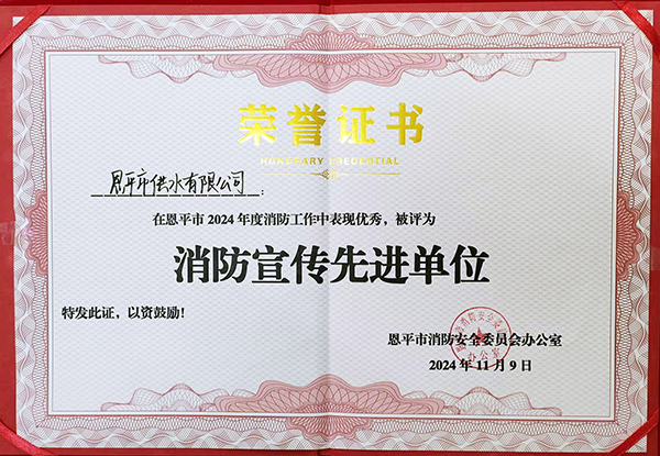 11月7日上午,在“119消防宣傳日”到來之際,恩平市舉行“全民消防 生命至上”消防安全宣傳活動(dòng)?;顒?dòng)對(duì)2024年度全市“消防宣傳先進(jìn)單位”和“消防宣傳先進(jìn)個(gè)人”進(jìn)行頒獎(jiǎng),我公司被評(píng)為全市消防宣傳先進(jìn)單位。