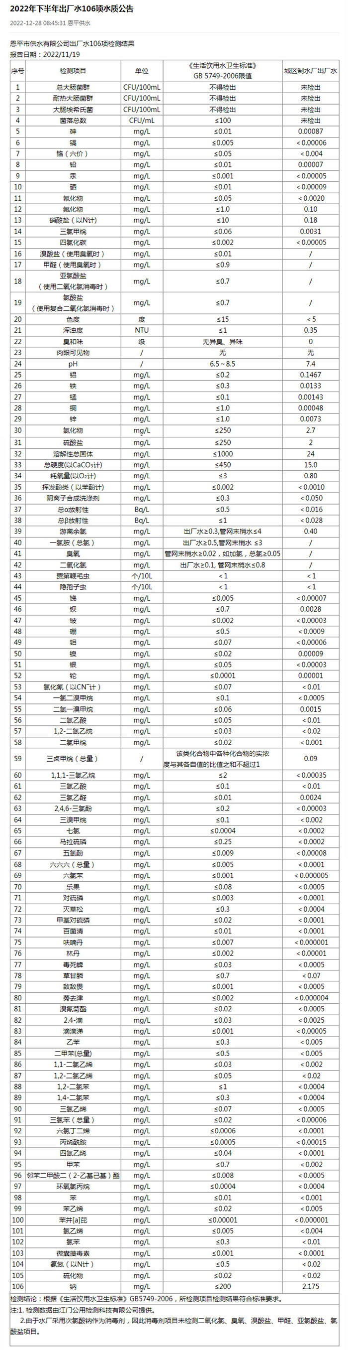 2022年11月106項(xiàng)出廠水檢測(cè)結(jié)果