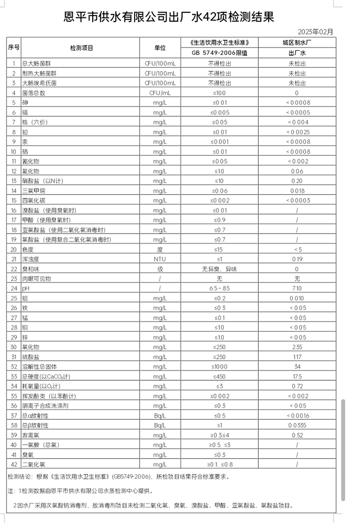2023年2月出廠水42項(xiàng)檢測結(jié)果