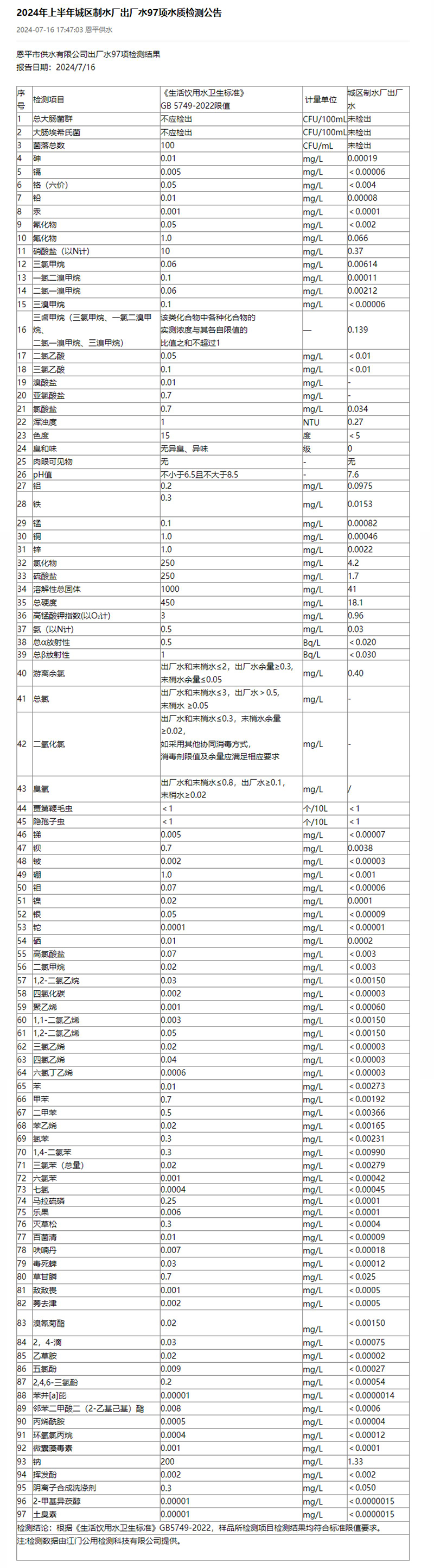 2024年上半年97項(xiàng)出廠水檢測(cè)結(jié)果